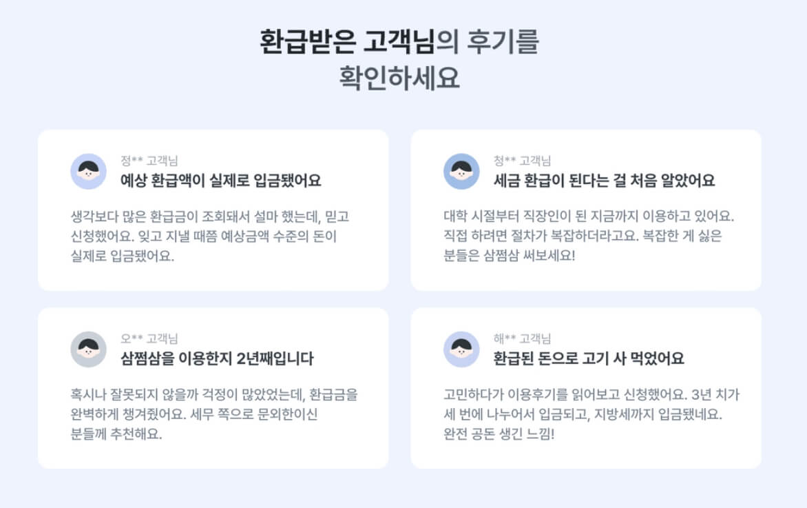 삼쩜삼에서는 조회해 주는 예상 환급액은 10명 중에 9.6명이 예상 환급금 보다 더 많거나, 동일한 환급금을 돌려받았습니다.