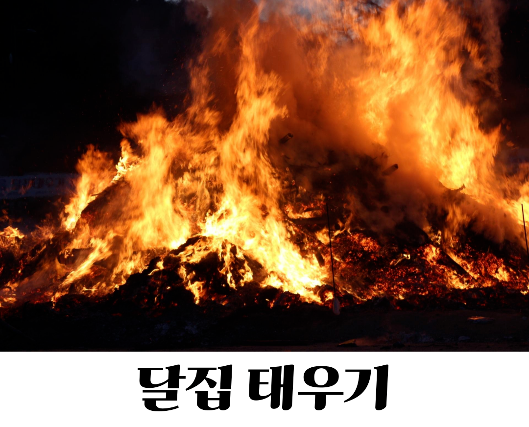 - 나무나 소나무 등의 나무로 달집을 만들고 짚풀로 불을 질러 새해 소원이 이루어지기를 기원하는 행사인데, 나무가 불에 타면서 나는 소리(탁탁)에 나쁜 귀신들이 무서워서 도망을 간다는 의미도 있습니다.