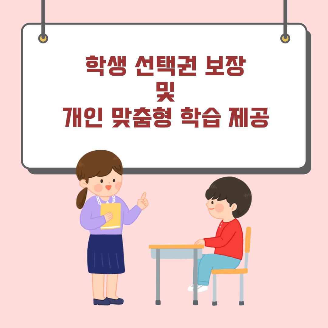 1. 학생 맞춤형 교육을 통해 획일적인 교육이 아니라 학생의 학습 동기와 흥미를 유발하여, 학생의 과목 선택권을 보장하는 진정한 학생 맞춤형 교육을 함으로써 적극적으로 수업에 임할 수 있습니다