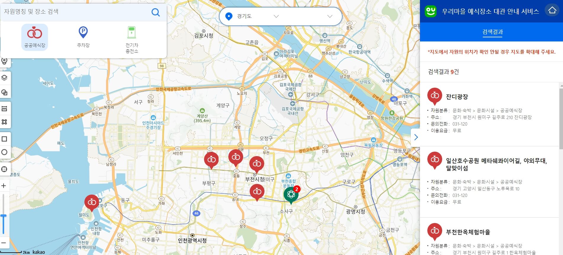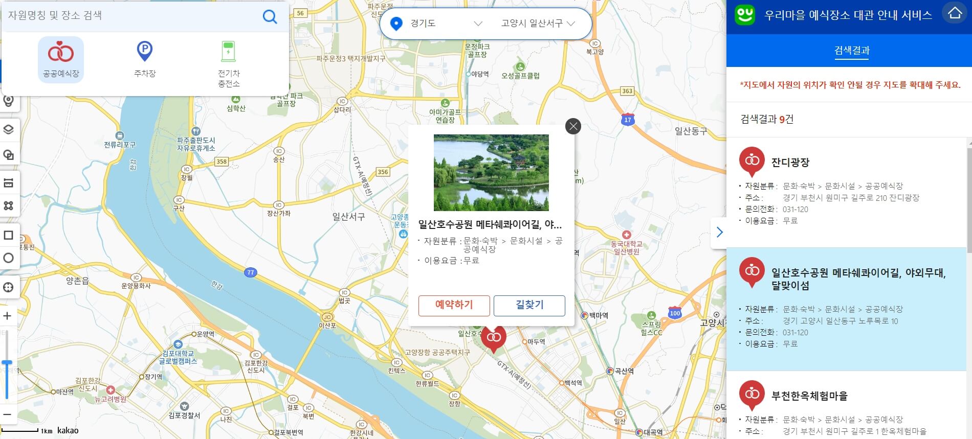 참고로 주차장 및 전기차 충전소 등 편의 시설 위치 확인이 가능하며, 각 시설별 이용 금액, 수용 가능한 인원, 피로연 가능 여부 등 상세한 정보를 확인할 수 있습니다